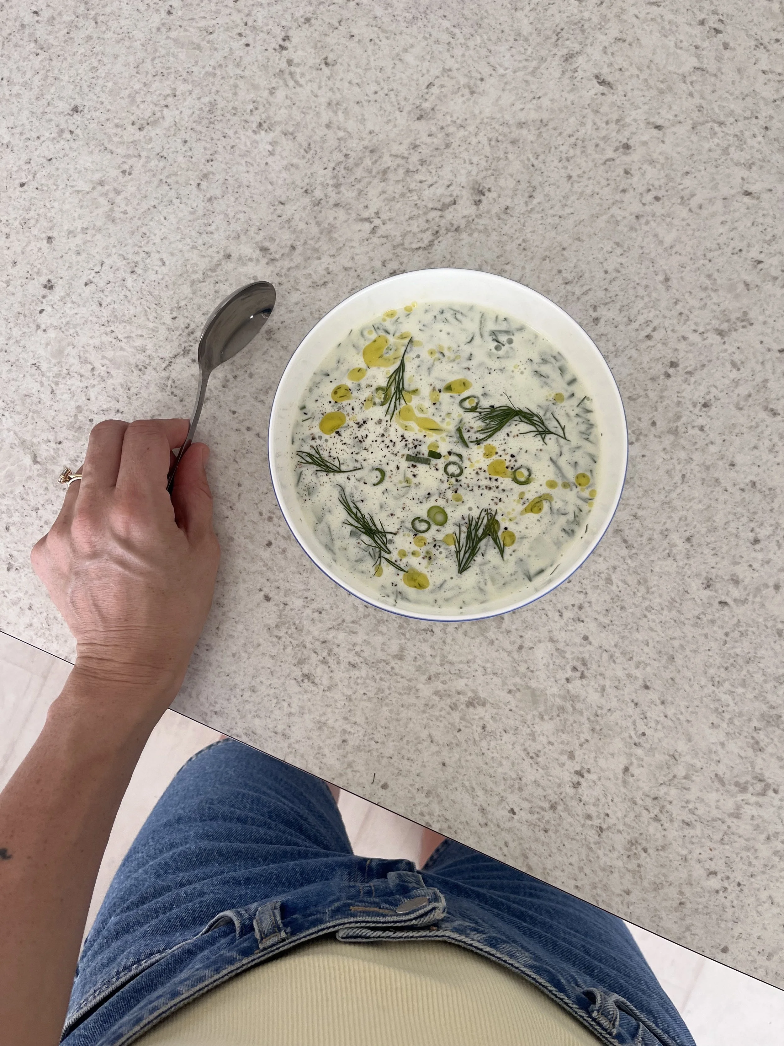 2. Stir in the remaining chopped cucumber, dill, spring onions, garlic, and lemon juice.